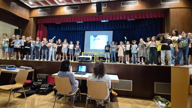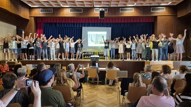 Ein weiterer Höhepunkt war das von den Klassen selbst gedichtete Lied „Applaus, Applaus“ für ihre Lehrkräfte – ein Dankeschön, das für viele Gänsehautmomente sorgte und mit großem Applaus belohnt wurde. Schließlich erhielten die Kinder von ihren Klassenlehrerinnen Frau Burger und Frau Müller ihre wohlverdienten Zeugnisse, ihre Abschlusszeitung, ein persönliches Abschlussgeschenk und viel Zuspruch für den neuen Lebensabschnitt.