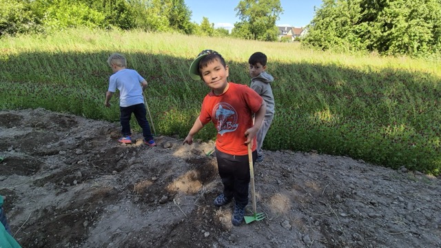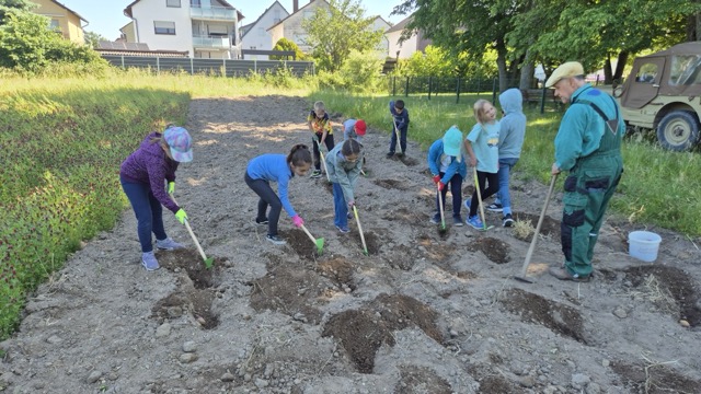 Erwartungsfroh und ausgerüstet mit Gartengeräten, Arbeitshandschuhen und natürlich dem Pausenvesper machten sich alle auf den Weg, um unter fachkundiger Anleitung von Herrn Manfred Walther Kartoffeln in die selbstgehackten Mulden zu legen, Paprika, Kürbis und Rote Bete zu pflanzen und Sonnenblumen auszusäen. Bis zur erhofften Ernte werden die Kinder immer mal wieder Ihren Acker besuchen, nach dem Rechten sehen und nach Bedarf Unkraut entfernen, Kartoffeln anhäufeln und was sonst noch so ansteht.