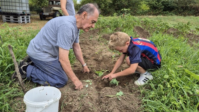Erste Erleichterung: Der Acker war mit viel Grün bedeckt. Dank Herrn Walters Einsatz sah nichts vertrocknet aus. Bei genauem Hinsehen entdeckten die Kinder aber, dass das Grün vor allem aus Gras und anderem Kraut bestand, so dass die Kartoffelpflanzen zunächst gar nicht zu entdecken waren. Darum lautete die Devise: das überschüssige Grün muss weg, damit die Kartoffeln sichtbar werden. Also wurde das Übel bei der Wurzel gepackt. Doch: Was ist Gras? Was ist Kartoffel? Kann das raus oder muss das stehenbleiben? Viele Fragen taten sich auf. Aber Zeit auf dem Acker ist ja auch Zeit zum Lernen und so lichtete sich nach und nach der Ackerdschungel. Am Ende konnten die freigelegten Kartoffelpflanzen zum ersten Mal angehäufelt werden, auch ein paar Kohlrabi wurden noch gepflanzt und die Kürbisse bekamen Wasser, damit sie gut wachsen.