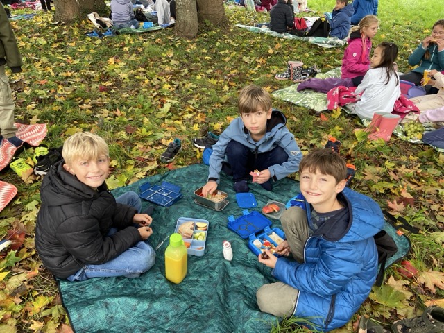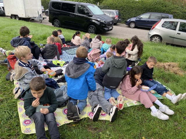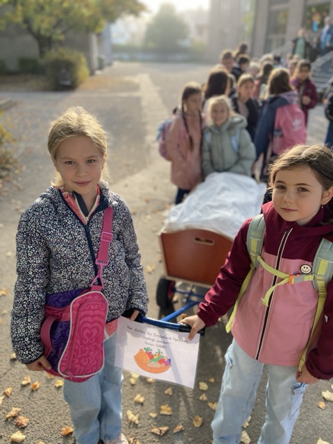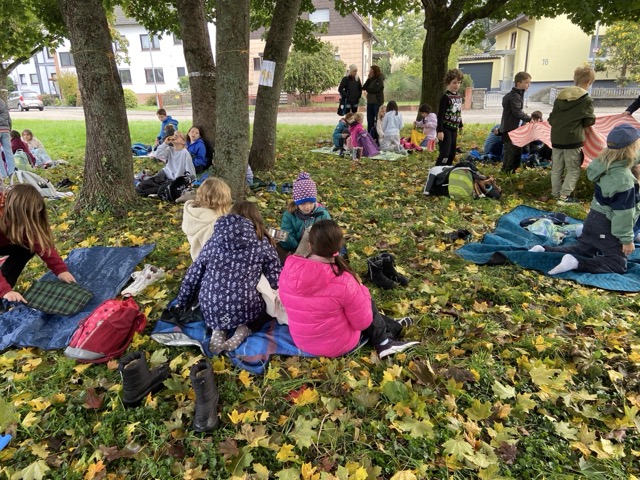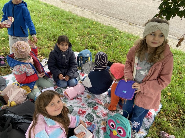 Nach dem Gottesdienst genossen alle Klassen ein fröhliches Picknick auf der einladenden Wiese. Anschließend durften einige Kinder der Klassen 3c, 4c und 4d die gesammelten Lebensmittel persönlich zum Gabenlädchen Rheinstetten bringen und hatten große Freude beim Einräumen des Ladens.