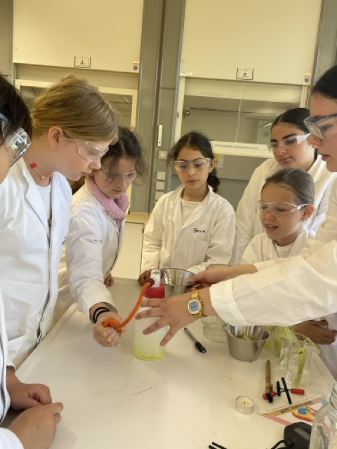 Die Klasse 4a fuhr am 10.05.2025 ins PH Labor, um dort gemeinsam mit Studierenden zu experimentieren. Mit der Bahn ging es nach Karlsruhe, wo wir um 9.00 Uhr an der Pädagogischen Hochschule empfangen wurden. Zuerst wurden uns die Regeln im Labor genannt und wir wurden mit Schutzkittel und Schutzbrille ausgestattet.