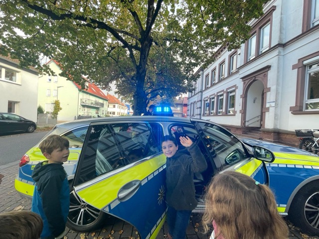 Auch das Thema sichtbare Kleidung, vor allem in der dunklen Jahreszeit, wurde ausführlich behandelt. Zum Abschluss gab es noch ein ganz besonderes Highlight: Die Kinder durften im Polizeiauto Platz nehmen und sogar einmal die Sirene einschalten.