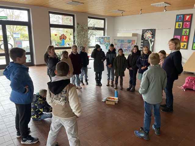Am Donnerstag, den 20. November hat uns Frau Schmidt-Schüssler wieder besucht. Das fanden alle spannend. In der Aula hat sie uns einen Behälter mit heißem Wasser gegeben. Dieser Becher soll den warmen Igel symbolisieren und wurde draußen versteckt. Das haben alle gut hinbekommen.