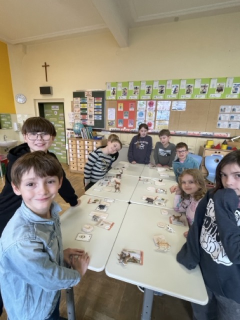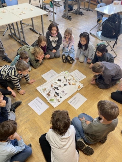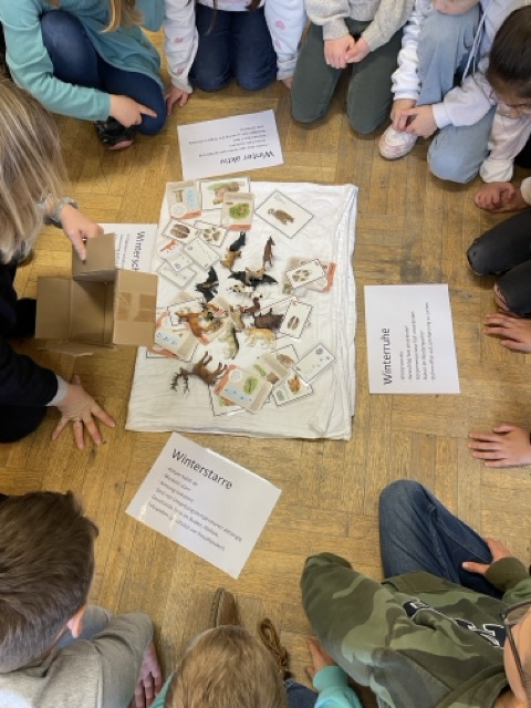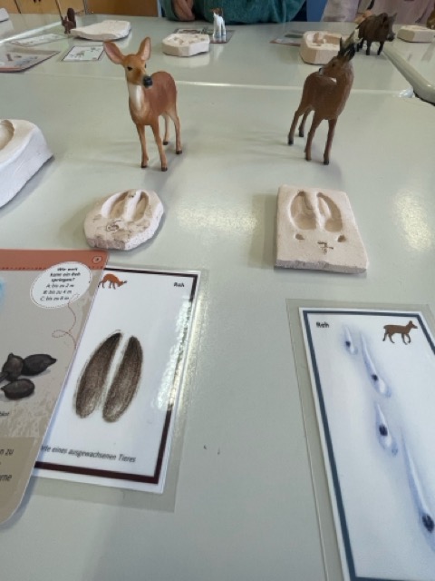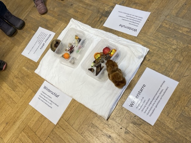 Danach waren wir drinnen und haben Tierspuren entdeckt. Dazu haben wir Tierfiguren sortiert und zum richtigen Pfotenabdruck gelegt. Auch mit den Überwinterungsstrategien einzelner Tiere machten wir uns vertraut. Wir haben außerdem neu gelernt, dass Eulen nicht jeden Bestandteil der Maus verdauen können - im Gegensatz zum Mäusebussard. Ebenso haben wir gelernt, dass der Borkenkäfer Tunnel unter den Bäumen graben kann. Darüber hinaus haben wir erfahren, dass Mäuse Tannenzapfen gründlich auffressen - im Gegensatz zu Eulen.