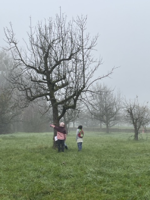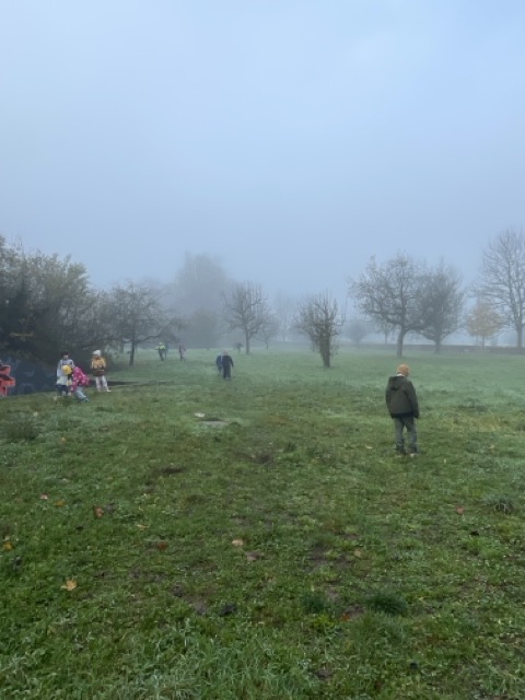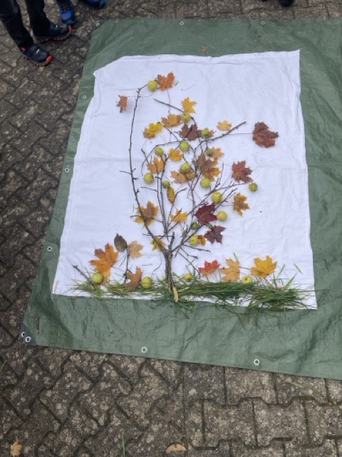 Verschiedene Aufgaben galt es zu bearbeiten: wie breit und lang ist die Fläche, wie viele Bäume wachsen darauf, welche Früchte sind zu erkennen oder auch das Beschreiben der Begrenzungen. Darüber hinaus gestalteten die Kinder in Land-Art einen Baum aus gefundenen Materialien und ergänzten diesen mit den Lebewesen, welche eine Streuobstwiese bevölkern.