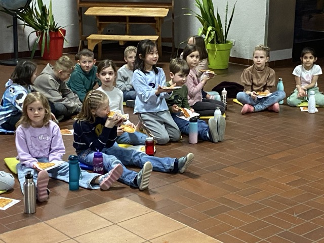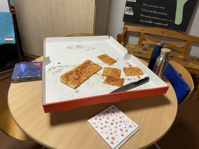 Ab 17.30 Uhr verwandelten sich die Klassenzimmer in gemütliche Nachtlager. Von der einfachen Isomatte bis hin zur Luxusluftmatratze XXL war alles vertreten. Nachdem die Schlafplätze kuschelig eingerichtet waren, versammelten sich alle in der Aula, in der es bereits lecker nach Pizza duftete.