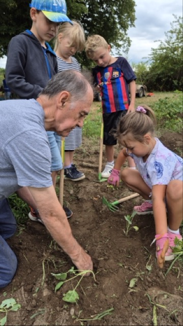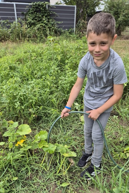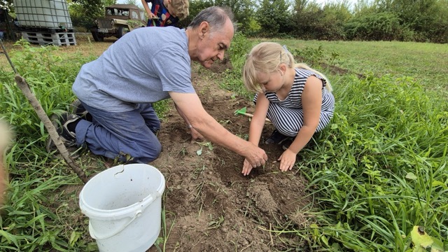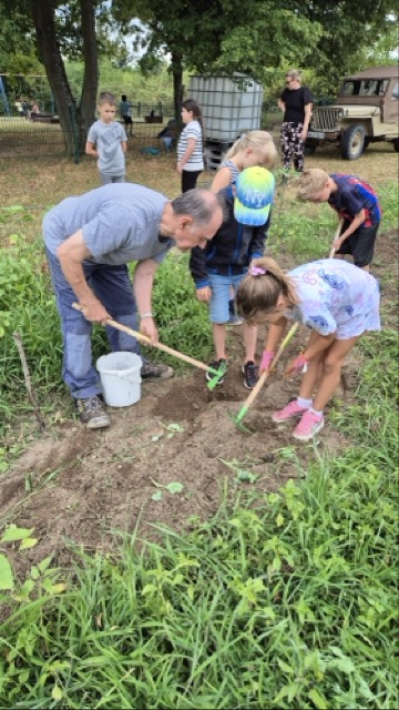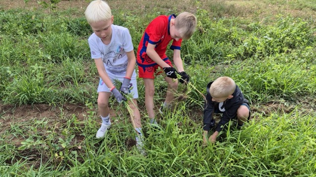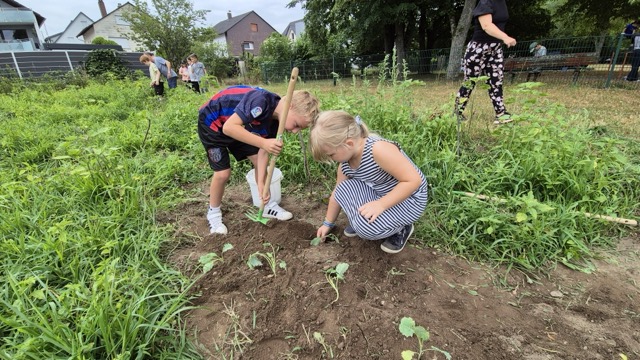Erste Erleichterung: Der Acker war mit viel Grün bedeckt. Dank Herrn Walters Einsatz sah nichts vertrocknet aus. Bei genauem Hinsehen entdeckten die Kinder aber, dass das Grün vor allem aus Gras und anderem Kraut bestand, so dass die Kartoffelpflanzen zunächst gar nicht zu entdecken waren. Darum lautete die Devise: das überschüssige Grün muss weg, damit die Kartoffeln sichtbar werden. Also wurde das Übel bei der Wurzel gepackt. Doch: Was ist Gras? Was ist Kartoffel? Kann das raus oder muss das stehenbleiben? Viele Fragen taten sich auf. Aber Zeit auf dem Acker ist ja auch Zeit zum Lernen und so lichtete sich nach und nach der Ackerdschungel. Am Ende konnten die freigelegten Kartoffelpflanzen zum ersten Mal angehäufelt werden, auch ein paar Kohlrabi wurden noch gepflanzt und die Kürbisse bekamen Wasser, damit sie gut wachsen.