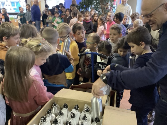 „Dankeschön,“ nahmen die Kinder die Trinkflaschen freudig entgegen.