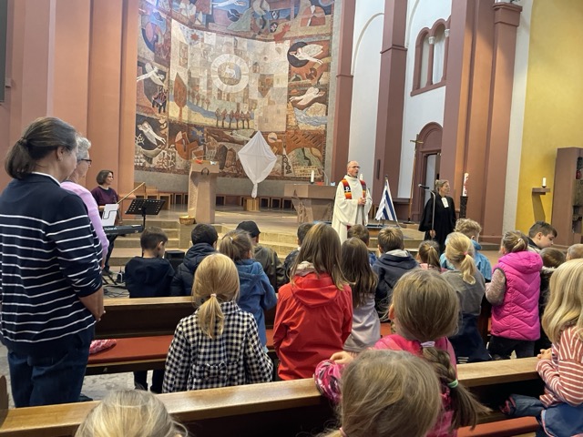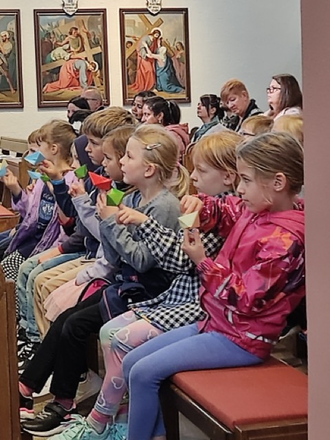 Heute am 18.9.24 besuchten die neuen Erstklässler den ökumenischen Gottesdienst. Dieser verbildlichte den Schülern durch die Geschichte, ein Boot im Sturm und dessen Stillstand, dass sie nie alleine sind und Hilfe erhalten. Zum Ende des Gottesdienstes durften die Schüler zur Erinnerung ein Papierschiffchen mitnehmen.