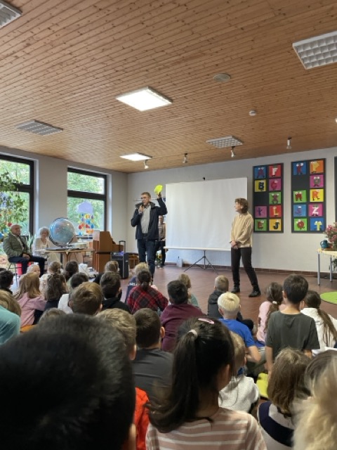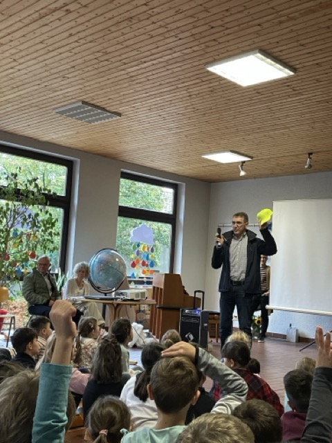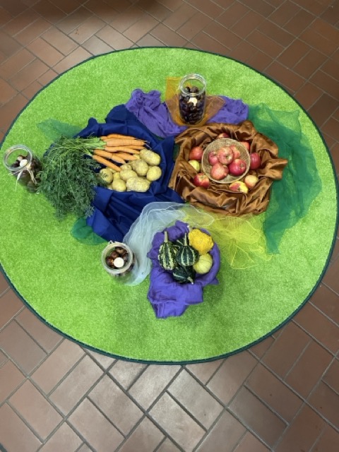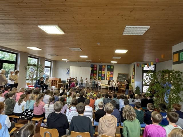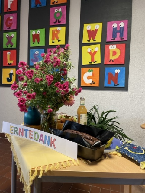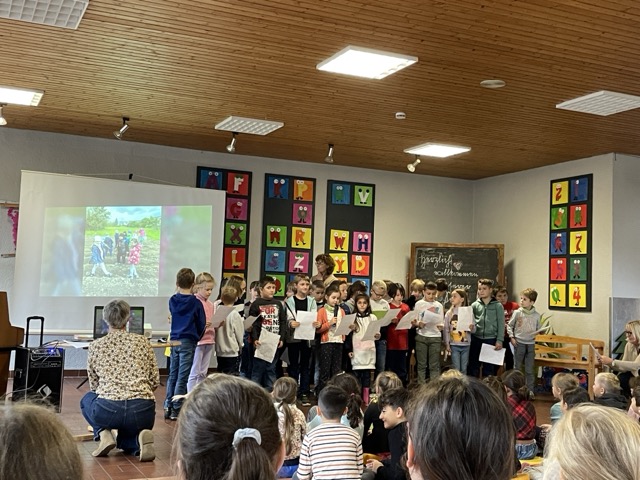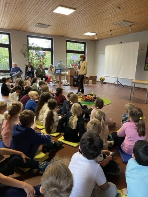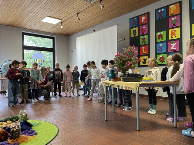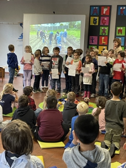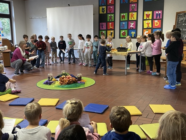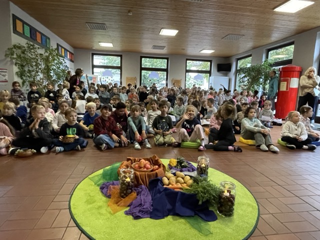 Am 08.10. trafen sich alle SchülerInnen und ihre LehrerInnen in der Aula zur gemeinsamen Erntedankfeier mit dem Thema „Kartoffel“. Auch einige Vertreter der Bürgerstiftung waren als besondere Gäste dabei. Nachdem der Herbst mit  einem Lied begrüßt wurde, folgten die Aufführungen der einzelnen Klassen. „Die Kinder aus der Lümmelklasse“ (Klasse 1a) sorgten für einen reich gedeckten Erntedanktisch, alles über die Kartoffel  erklärte die Klasse 1b mit einem Gedicht. Die zweiten Klassen erzählten eine spannende Zeitreise über ihren Kartoffelacker und gaben anhand vieler Bilder Einblick in ihr Jahresprojekt mit Herrn Walther. In diesem Rahmen dankte Frau Wesserling Herrn Walther für die jahrelange tatkräftige Unterstützung bei der Bewirtschaftung des Ackers.