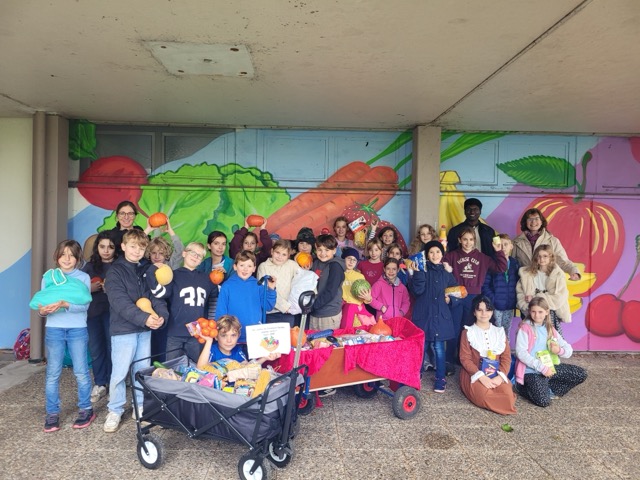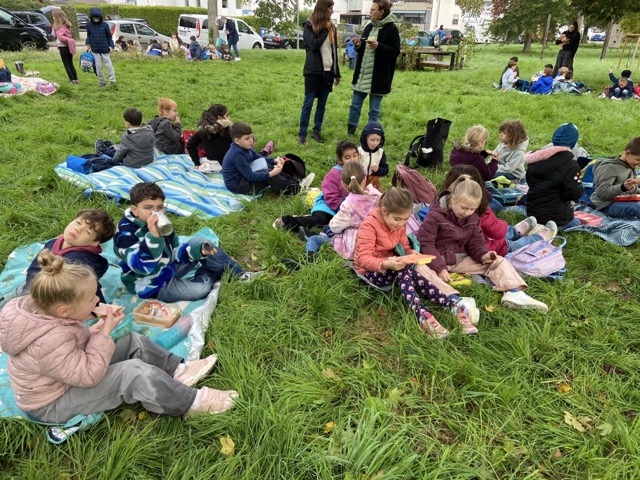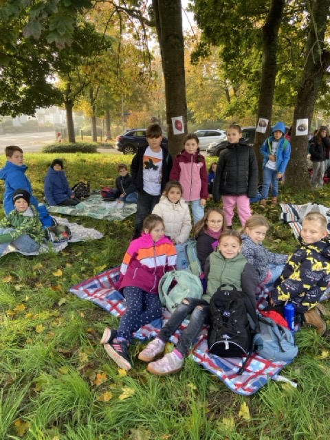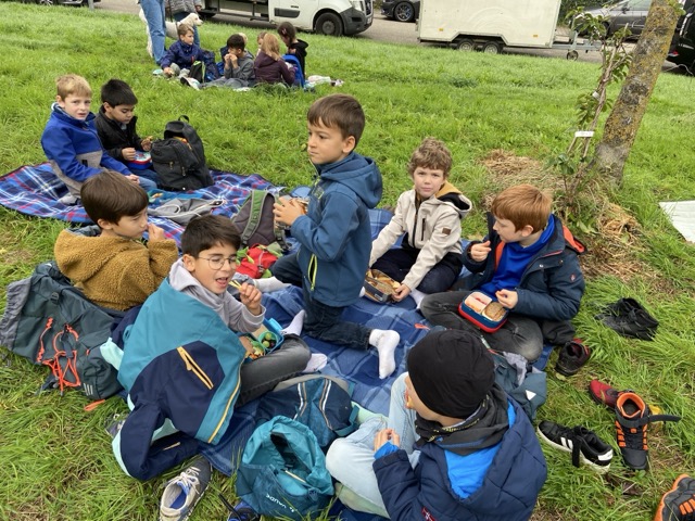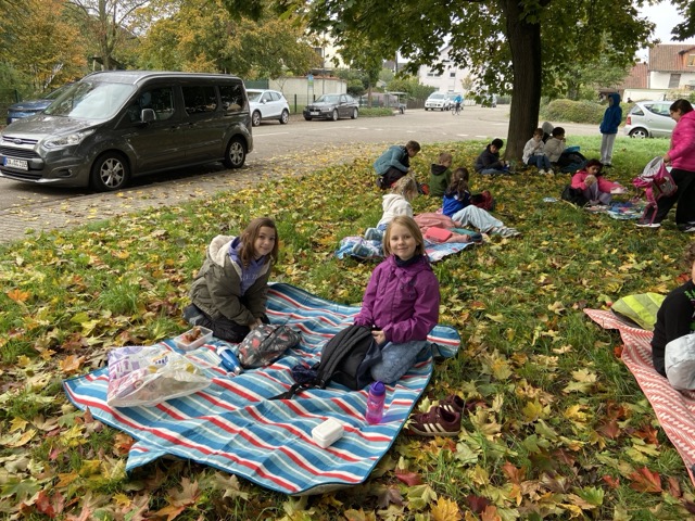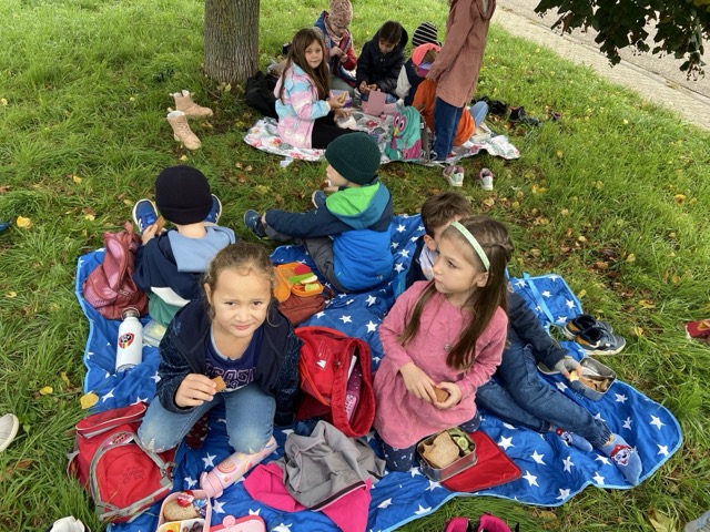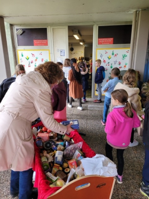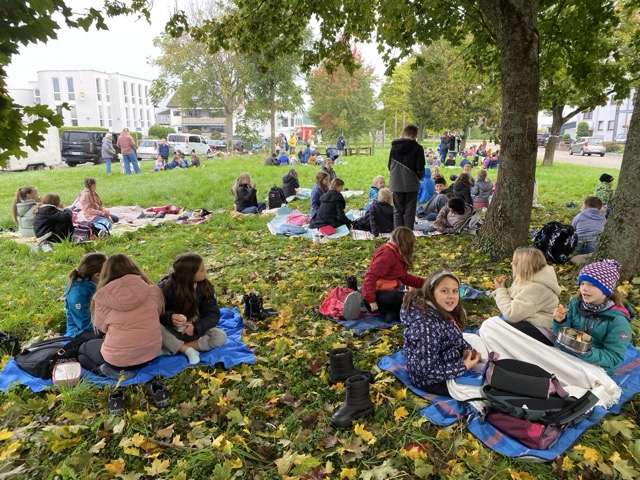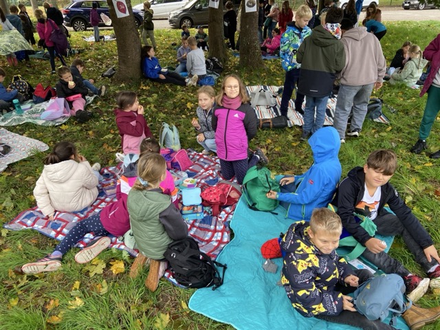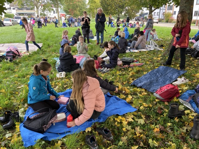 Nach dem Gottesdienst genossen alle Klassen ein fröhliches Picknick auf der einladenden Wiese. Anschließend durften einige Kinder der Klassen 3c, 4c und 4d die gesammelten Lebensmittel persönlich zum Gabenlädchen Rheinstetten bringen und hatten große Freude beim Einräumen des Ladens.