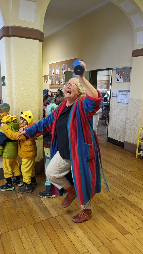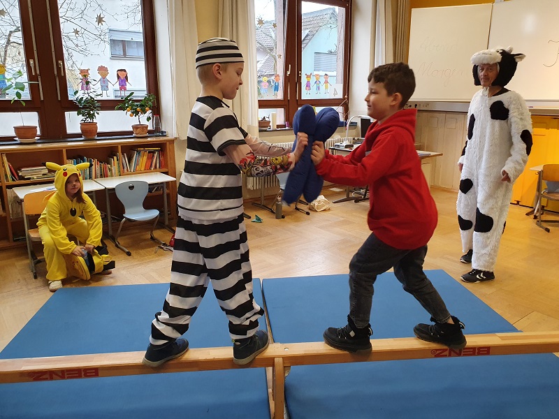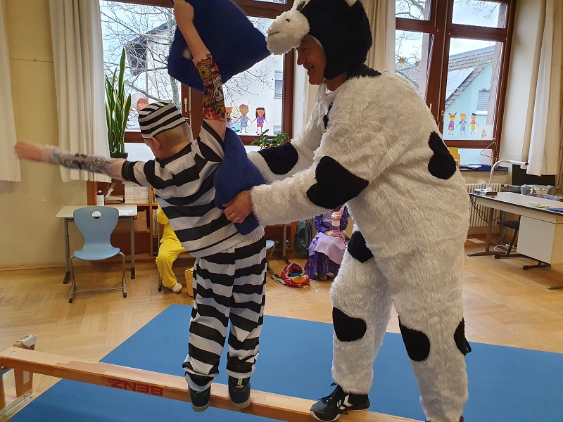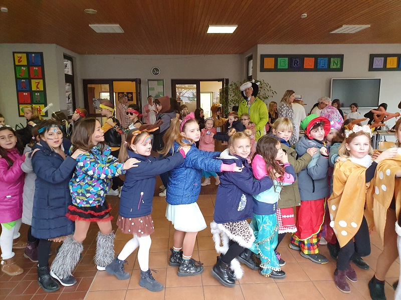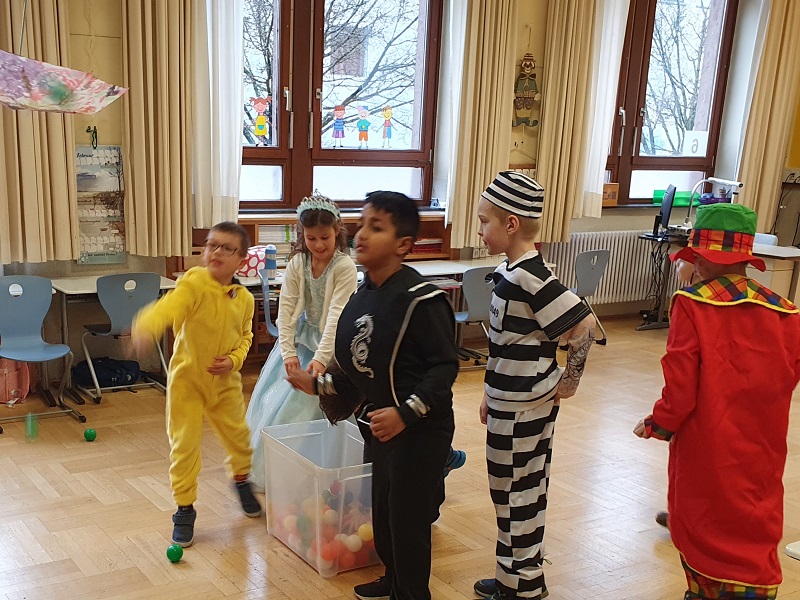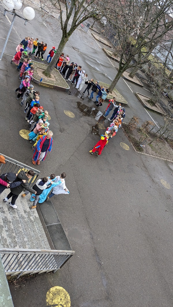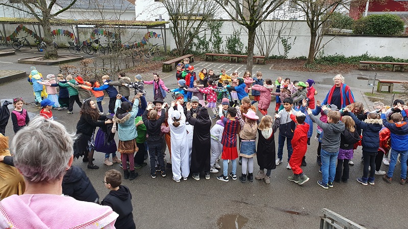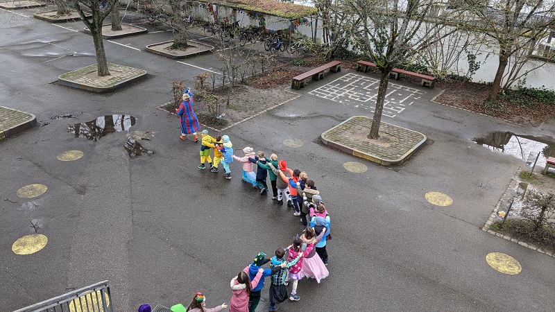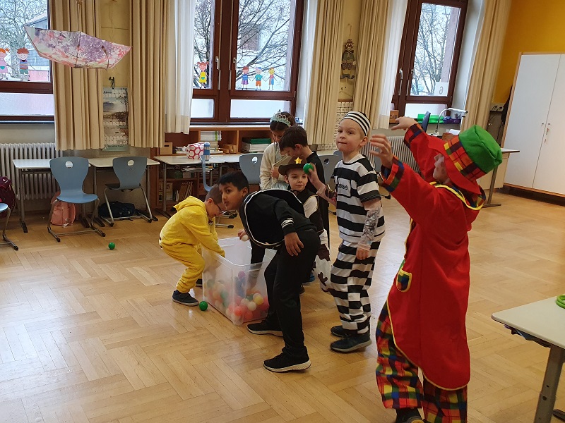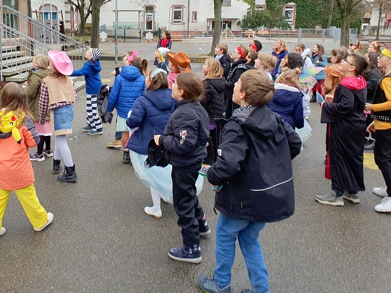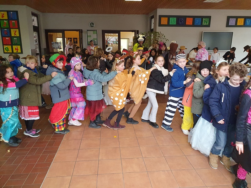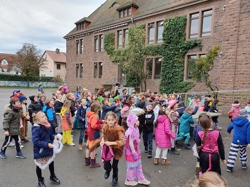 Ab 10.45 Uhr wurde dann die große Polonaise durchs Schulhaus gestartet, um anschließend auf dem Schulhof gemeinsam weiter zu feiern. Ein weiterer Höhepunkt war das Bonbonwerfen in der großen Pause, bei dem die Schülerinnen und Schüler mit Begeisterung Süßigkeiten fingen. Um 12.25 Uhr endete schließlich das bunte Treiben und die Kinder wurden in die Fastnachtsferien entlassen.