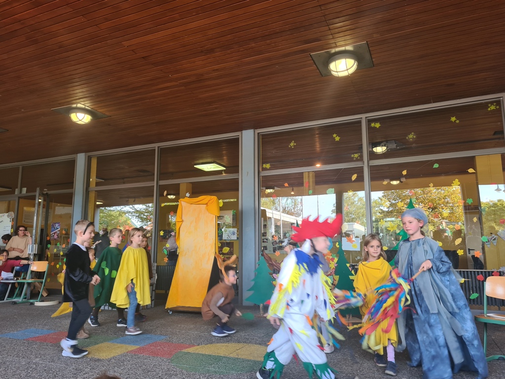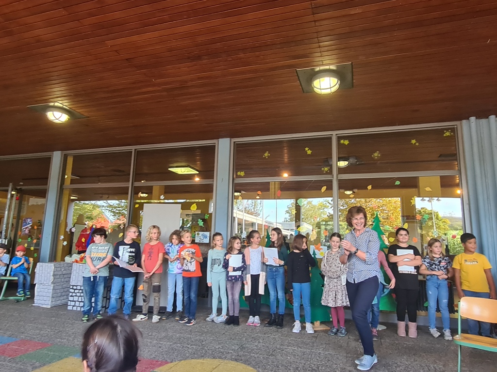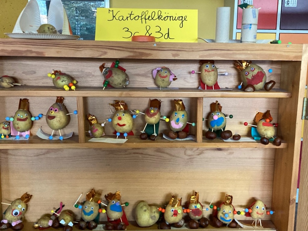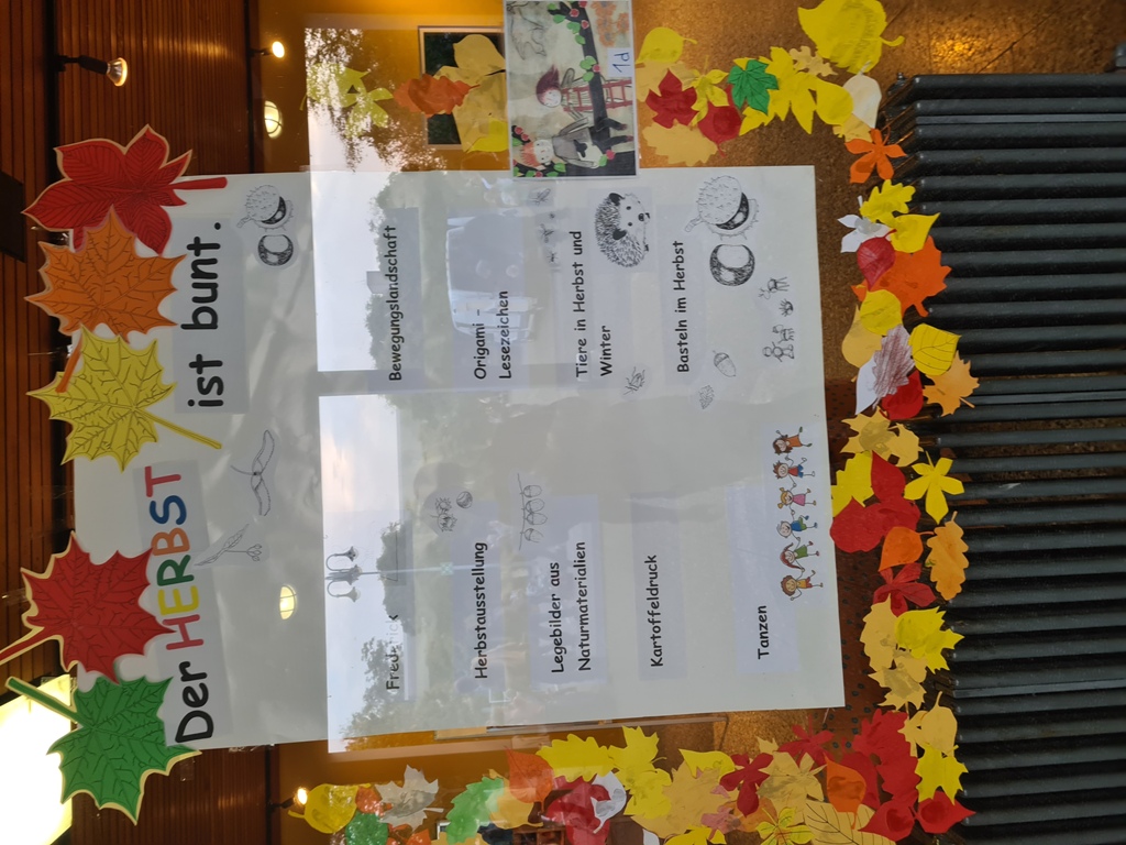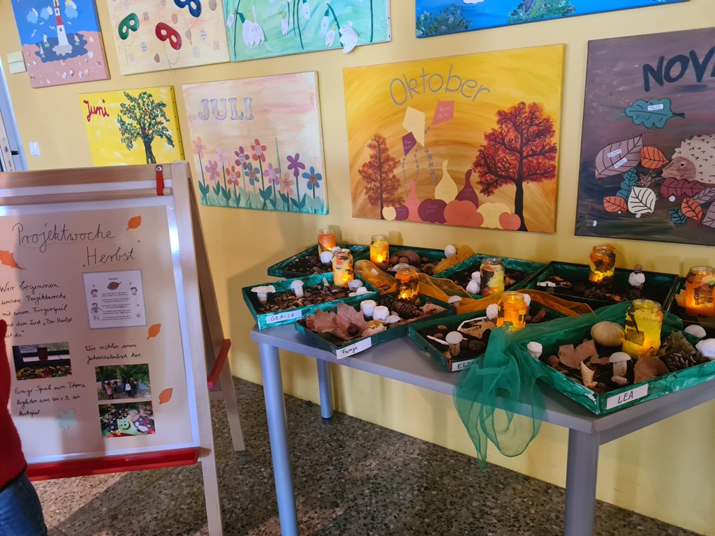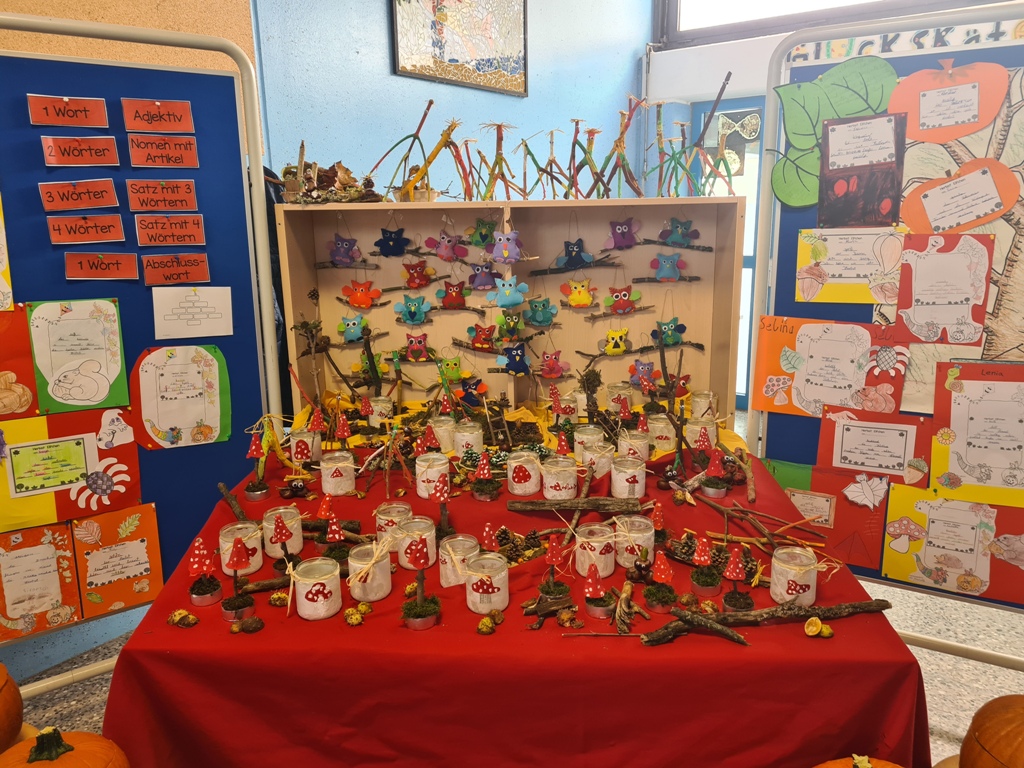In den zweiten Klassen wurde das Bilderbuch „Frederick“ unter die Lupe genommen, ein Gartenbeet mit bunten Steinen gestaltet und ein Blättertanz mit bunten Tüchern gelernt. Die Drittklässler erarbeiteten alles rund um die Kartoffel und kochten in der Schulküche köstliche Kartoffelgerichte. Geschnitzte Kürbisgesichter, selbst genähte Eulen, Windlichter und kreative „Herbst-Elfchen“ sah man in der Herbstwerkstatt der vierten Klassen.
