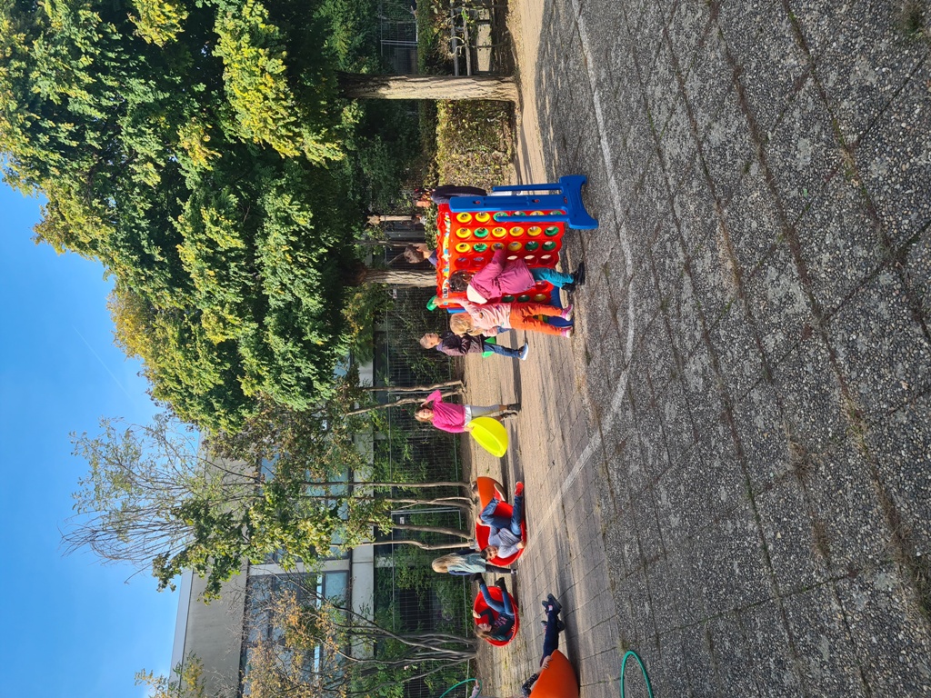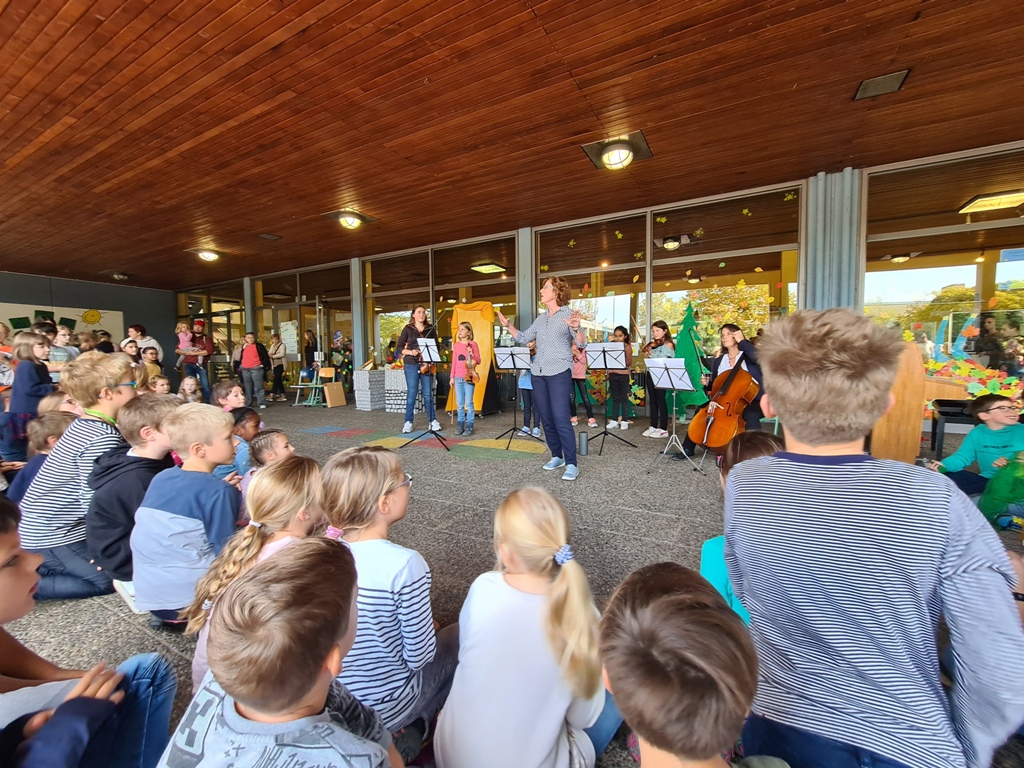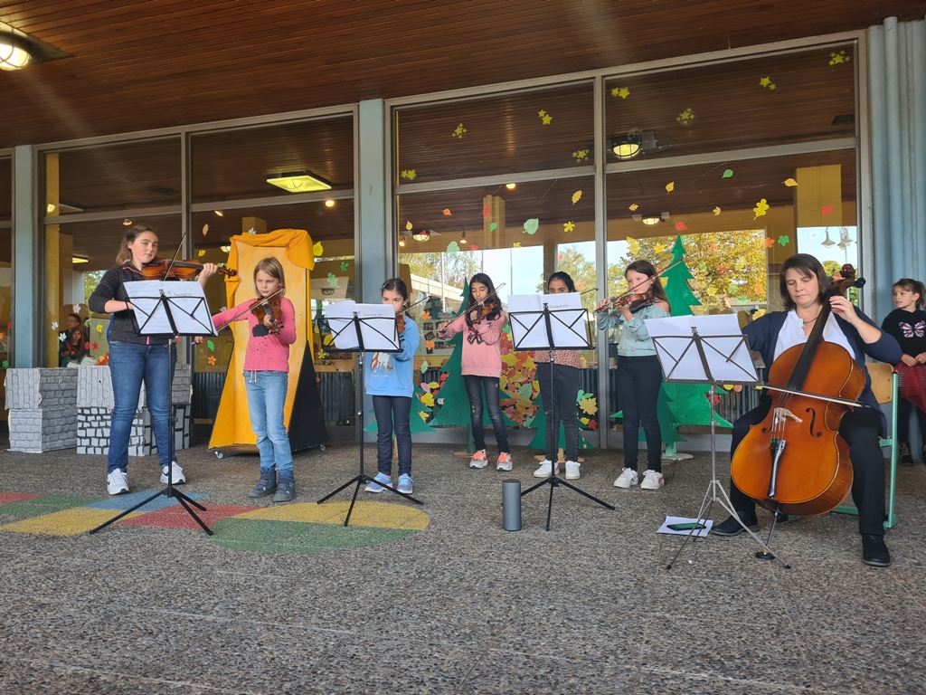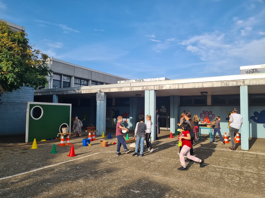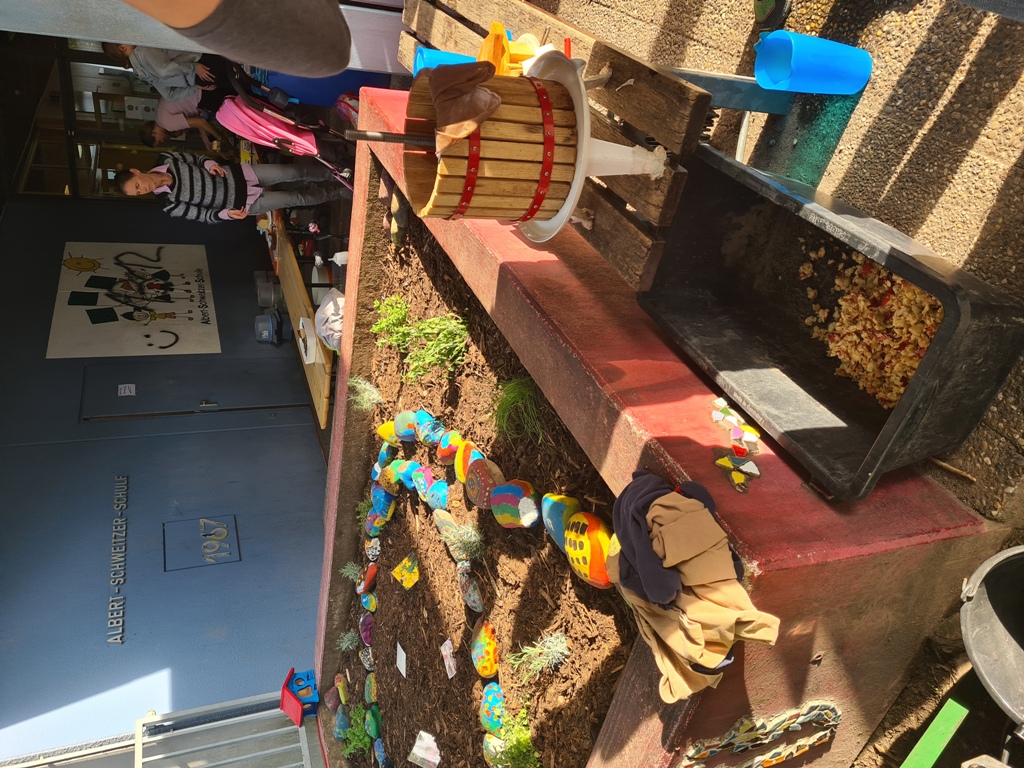 Abgerundet wurden die Projekttage mit einem tollen Schulfest bei sonnigen Temperaturen mit selbstgepressten Apfelsaft, vielen Bastelangeboten, einer Instrumentenstraße, Kastanienenzielwurf, Dosenwerfen und dem „Krokomobil“.