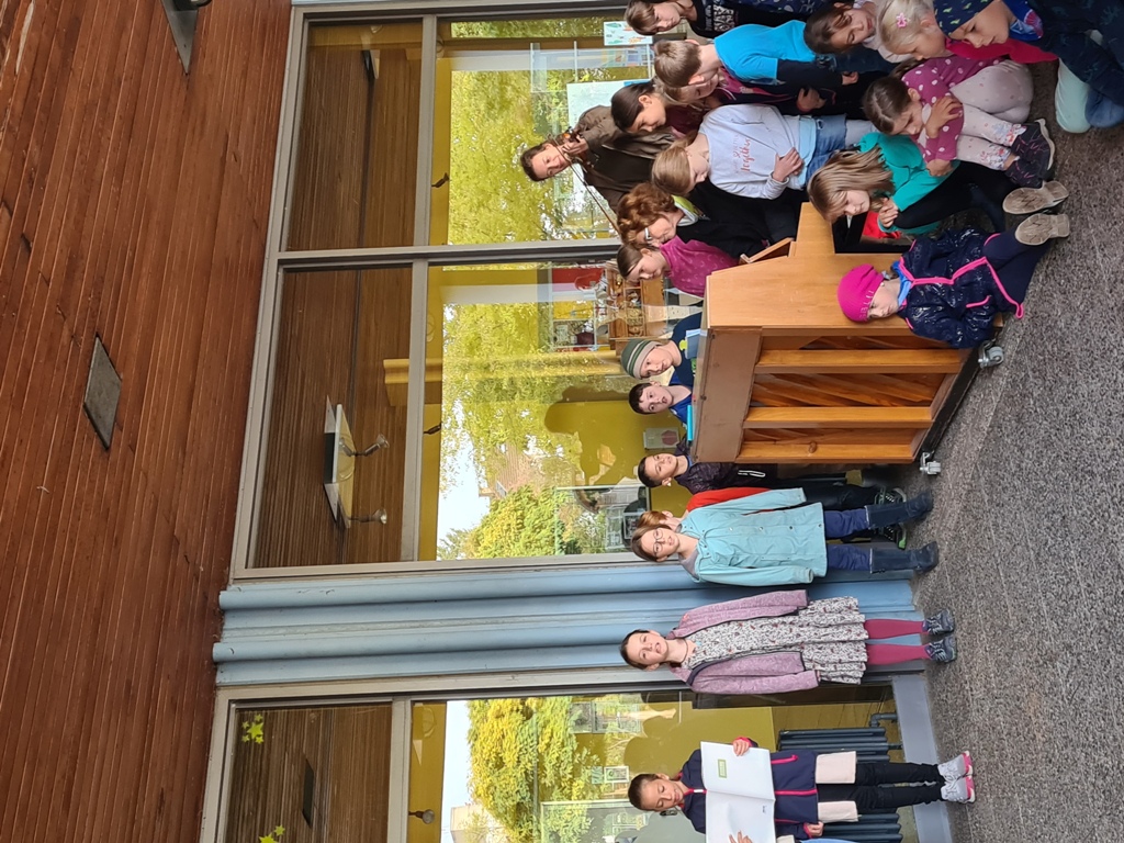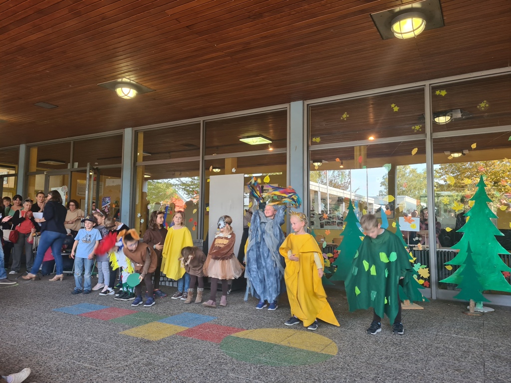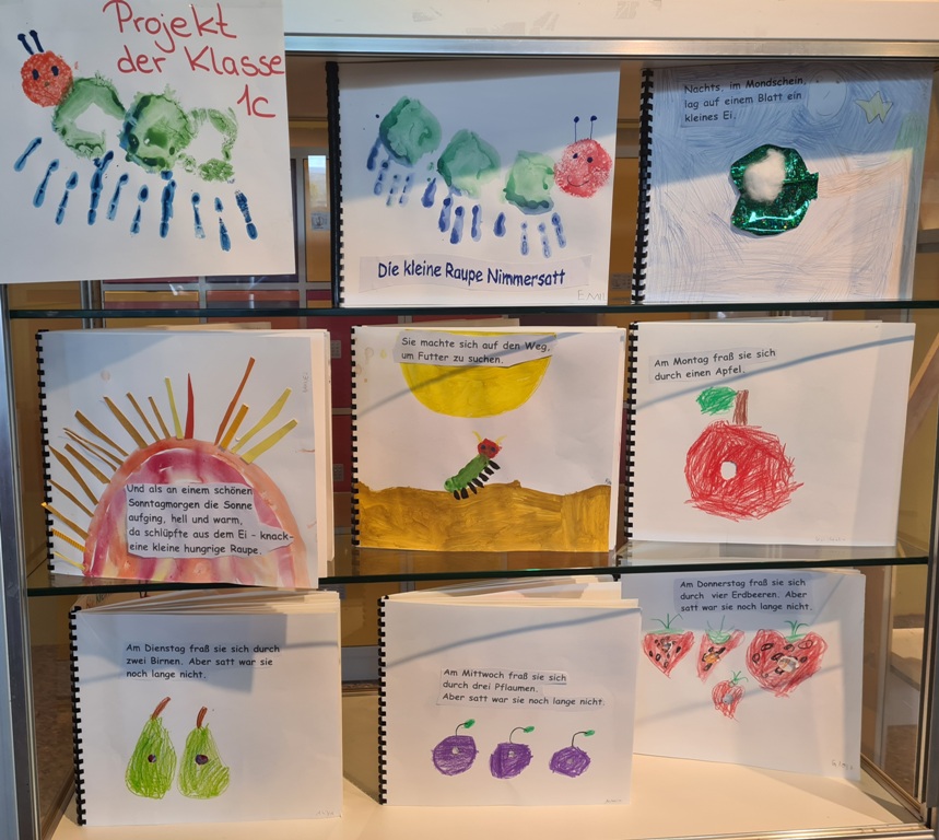 Dabei beschäftigten sich die Erstklässler mit dem Bilderbuch „Die kleine Raupe Nimmersatt“ und gestalteten ein eigenes Bilderbuch mit Händen und auch Füßen. Außerdem wurde ein Bewegungssingspiel über den Wind einstudiert und mit tollen, bunten Kostümen auf dem Schulfest präsentiert.
