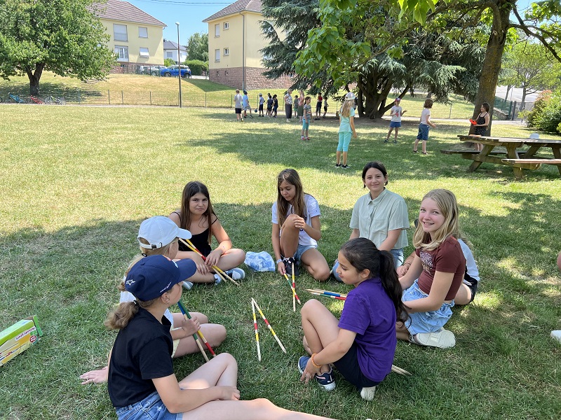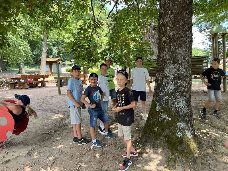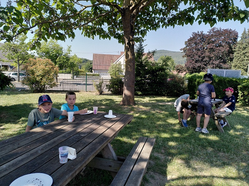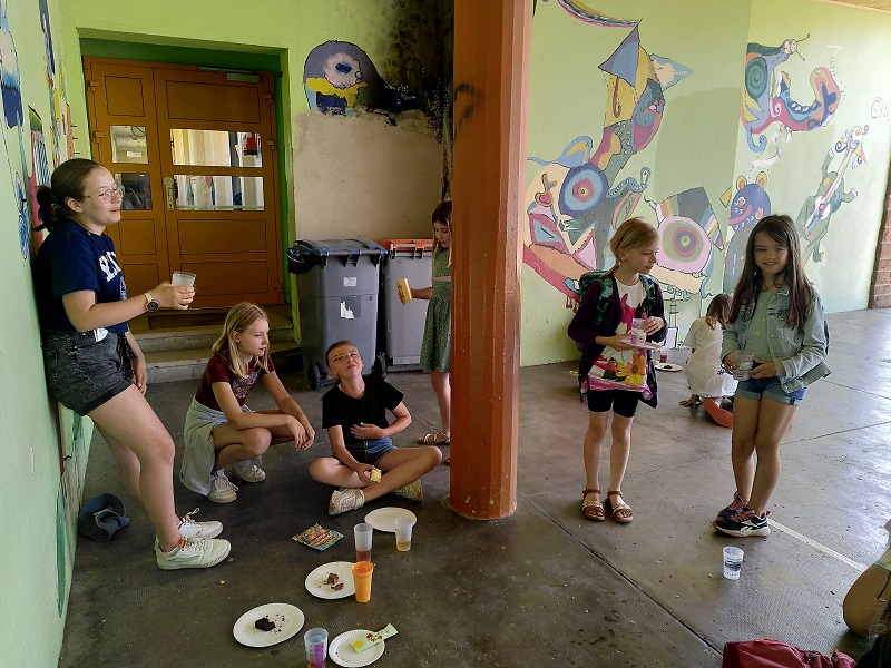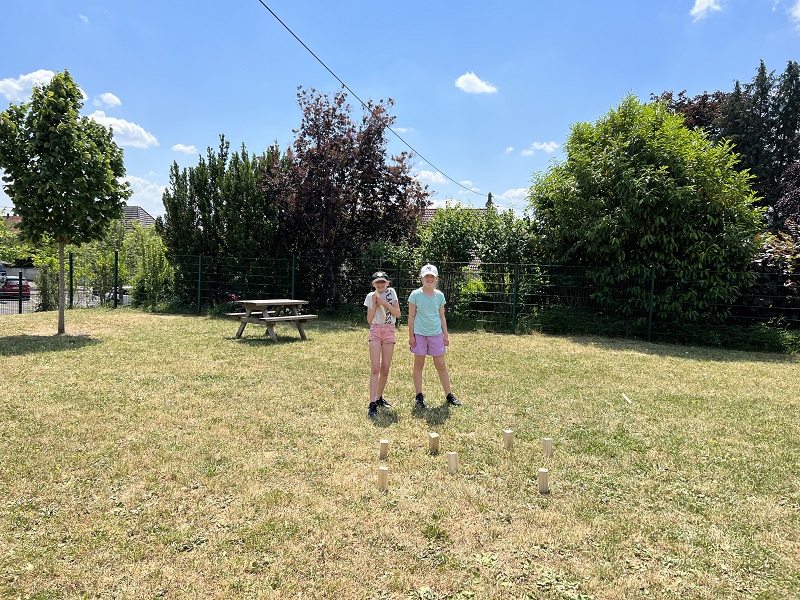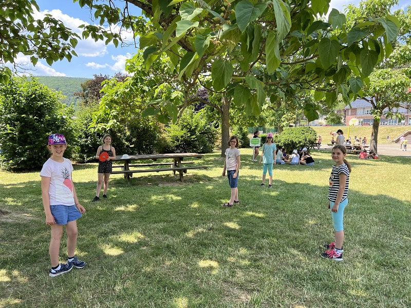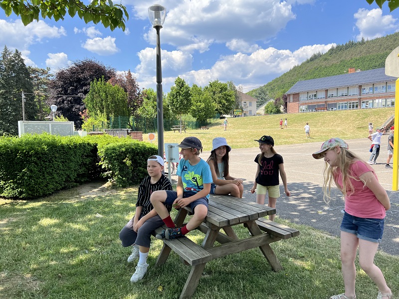 Am Donnerstag, den 15.06.2023 fuhren wir mit Frau Becker, Frau Freiesleben und zwei Studentinnen zu unserer Partnerschule in Niederbronn. Der Ausflug begann erst einmal mit einer zweistündigen lustigen Busfahrt. Als wir ankamen erwartete uns ein großes Buffet mit leckerem Kuchen und erfrischenden Getränken. Besonders der Schokokuchen und der Himbeereistee waren sehr beliebt! Anschließend wurden uns unsere Partner zugeteilt, die wir aus Briefen schon ein wenig kannten. Wir konnten miteinander spielen. Das klappte sehr gut, denn unsere Partner konnten schon sehr gut deutsch. Danach gingen wir in ihr Klassenzimmer und wir bastelten Origami und spielten Memory, Uno und Schach. Anschließend machten wir einen Ausflug auf einen Spielplatz. Dort entdeckten wir sogar zwei riesige Hirschkäfer! Zurück an der Schule konnten wir noch auf dem Pausenhof spielen und uns am Buffet stärken. Zum Abschluss sangen wir zusammen ein Lied und dann ging es leider schon wieder nach Hause. Das war ein toller Tag mit vielen Erlebnissen!
