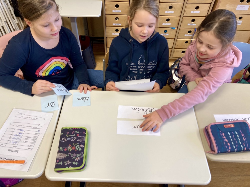Hoch motiviert wurden in Gruppen zu den aktuellen Sprachthemen Kärtchen geschrieben und vorbereitet. Die Gruppen mussten sich dazu genau absprechen, wie sie die einzelnen Themen genau erklären möchten und welche Beispiele sie dazu anbringen.