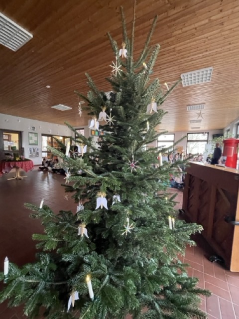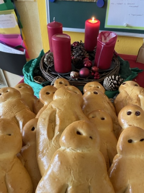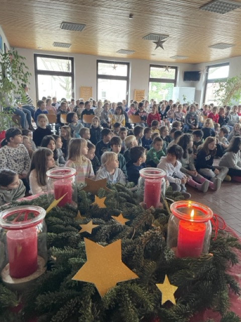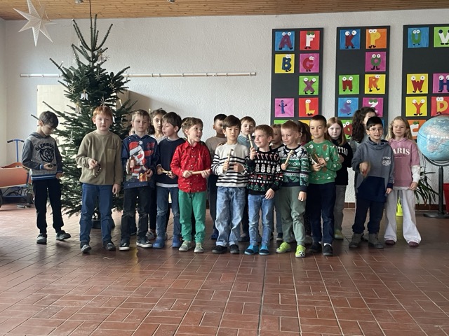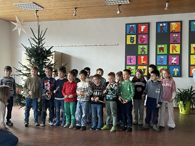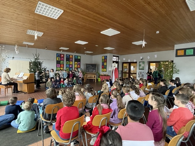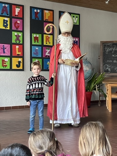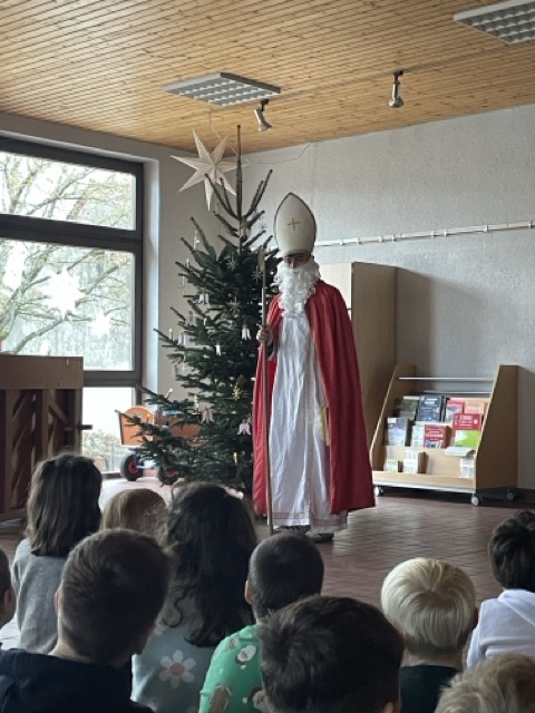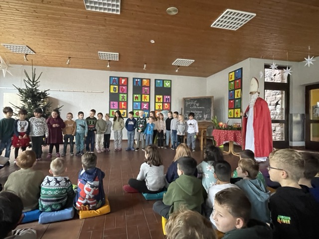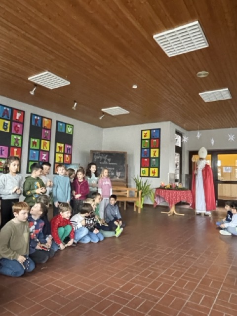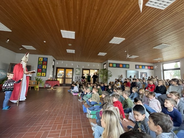 Mit dem Lied „Sei gegrüßt, lieber Nikolaus“ haben wir gemeinsam den Nikolaus „herbeigesungen“. Nachdem sich der Nikolaus bei uns eingefunden hatte, durften unsere beiden ersten Klassen ihm und der Schulgemeinschaft etwas vortragen: Zum einen ein Nikolausgedicht, das unsere Kleinen schon wie ganz Große auswendig gelernt hatten.Zum anderen sangen sie das Lied „Lieber guter Nikolaus, so höre doch“ vor, welches sie mit Glöckchen und Rasseln rhythmisch gekonnt begleiteten. Jetzt war es für den Nikolaus an der Zeit, aus seinem großen goldenen Buch vorzulesen. Es gab viel Lob, weshalb ermit Unterstützung seiner Fördervereins-Helferlein für alle leckere Dambedeis mitgebracht hatte. Mit einem kräftigen „Lustig, lustig, trallalala“ verabschiedeten wir uns vom Nikolaus und freuen uns schon auf den nächsten Besuch von ihm.