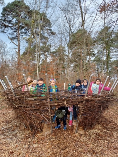 Welche Tiere sieht man tagsüber nicht, da sie nur nachtaktiv sind? Springt eine Heuschrecke tatsächlich weiter als ein Eichhörnchen? Diese Fragen und noch viele mehr wurden auf der Waldrunde beantwortet, außerdem konnten die Kinder selbst zum Thema einiges beitragen und ihr Wissen, das sie sich im Unterricht bereits angeeignet haben, unter Beweis stellen. Am Ende konnten die Kinder nicht nur die Tiere aus Holz, wie Fledermaus, Marder, Buntspecht oder Wildschwein in ihrem Lebensraum anschauen, sondern von der Aussichtsplattform aus das wirklich echte Rotwild im Wildgehege beobachten. Es war ein sehr schöner Vormittag im Wald, die Kinder waren begeistert und nahmen sich vor, unbedingt mit ihren Eltern nochmal das Naturschutzzentrum zu besuchen.