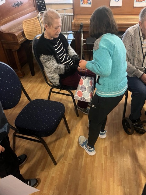 Zur Begrüßung sang die Klasse zwei Lieder und stellte sich anschließend kurz vor. Danach kamen die Schülerinnen und Schüler mit den Tagespflegegästen ins Gespräch. In kleinen Gruppen führten sie Interviews über das Leben in Mörsch:
