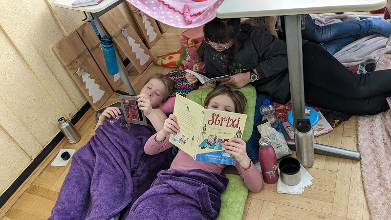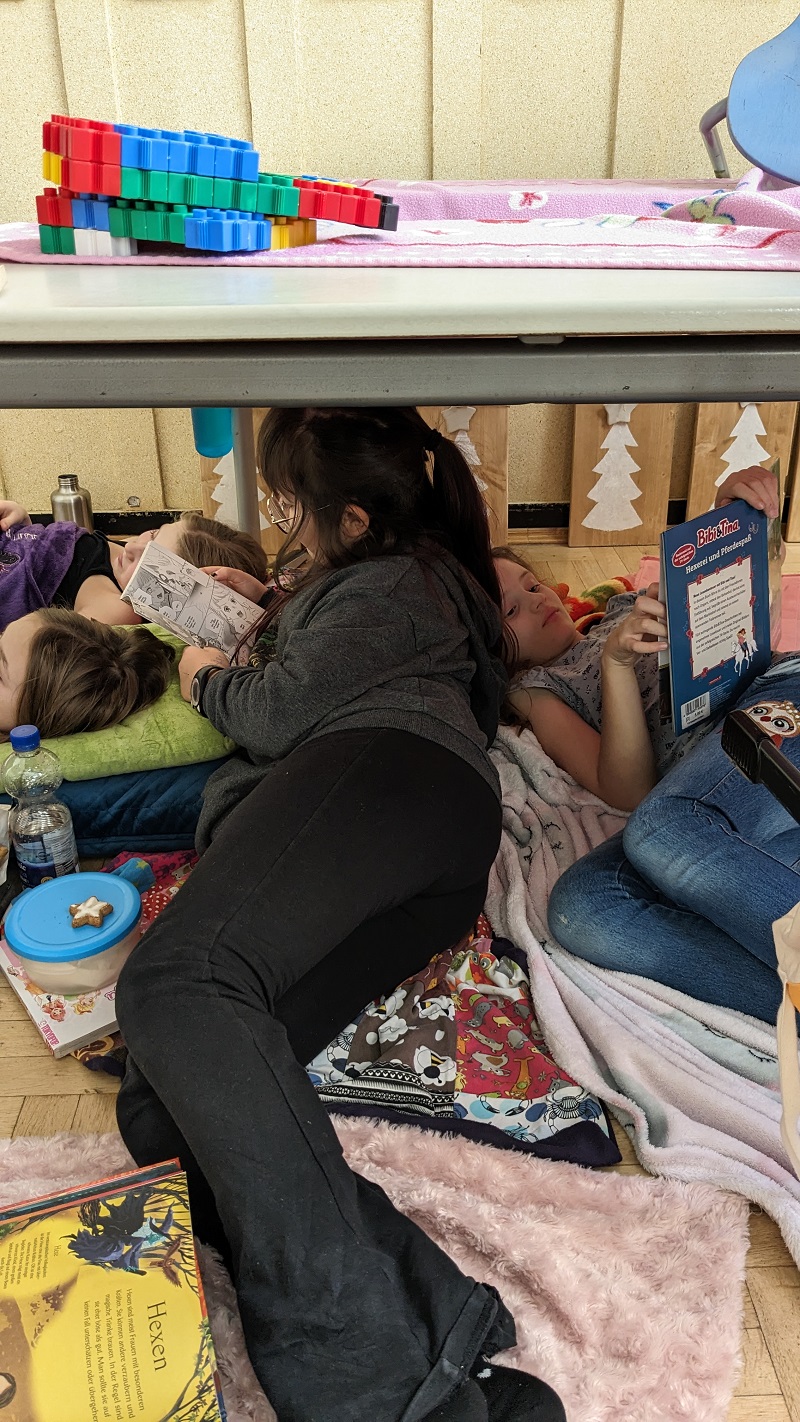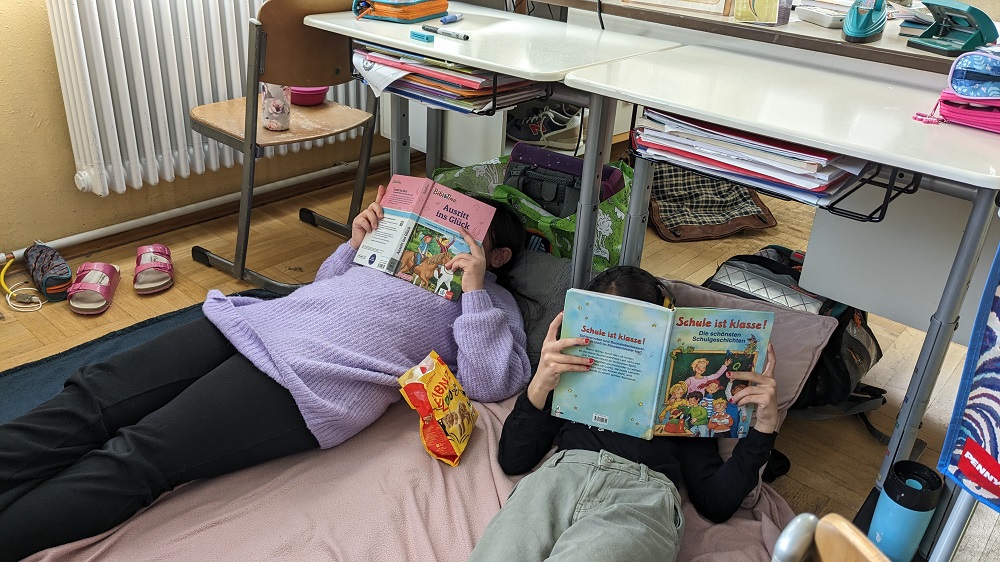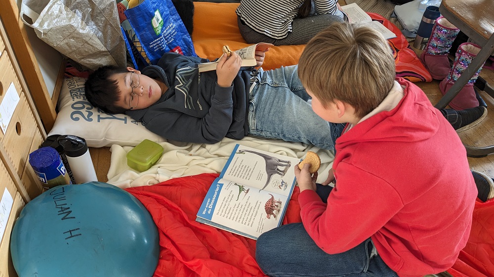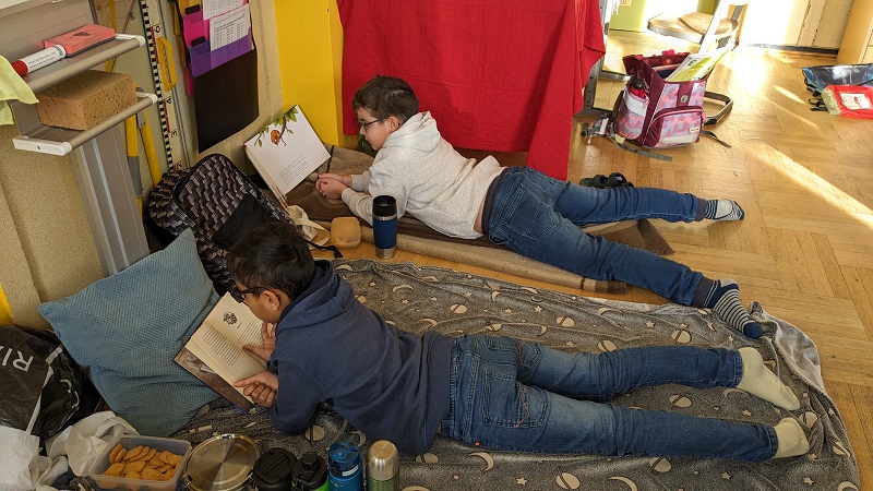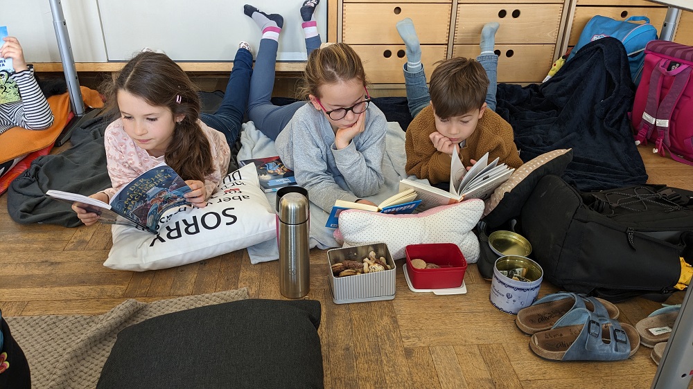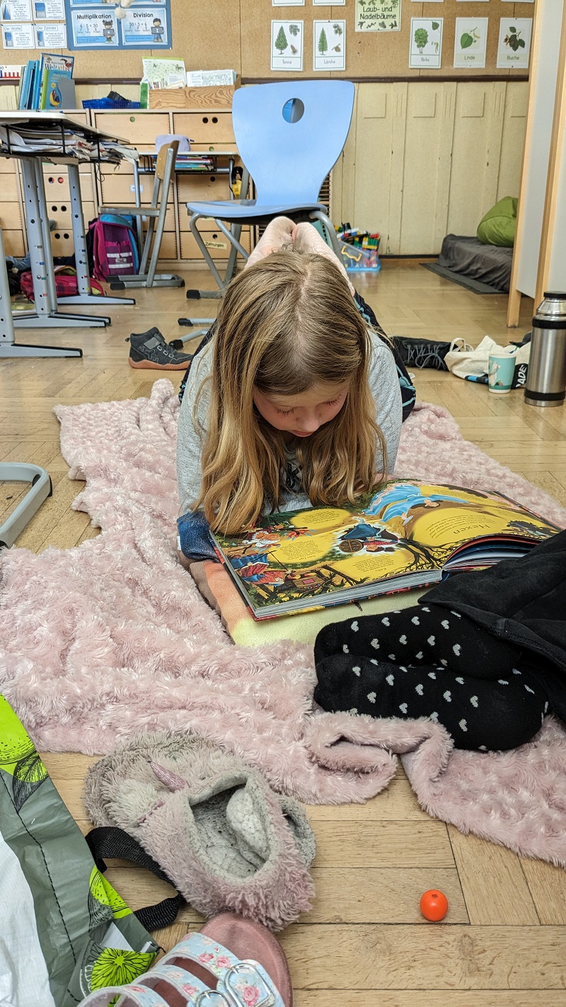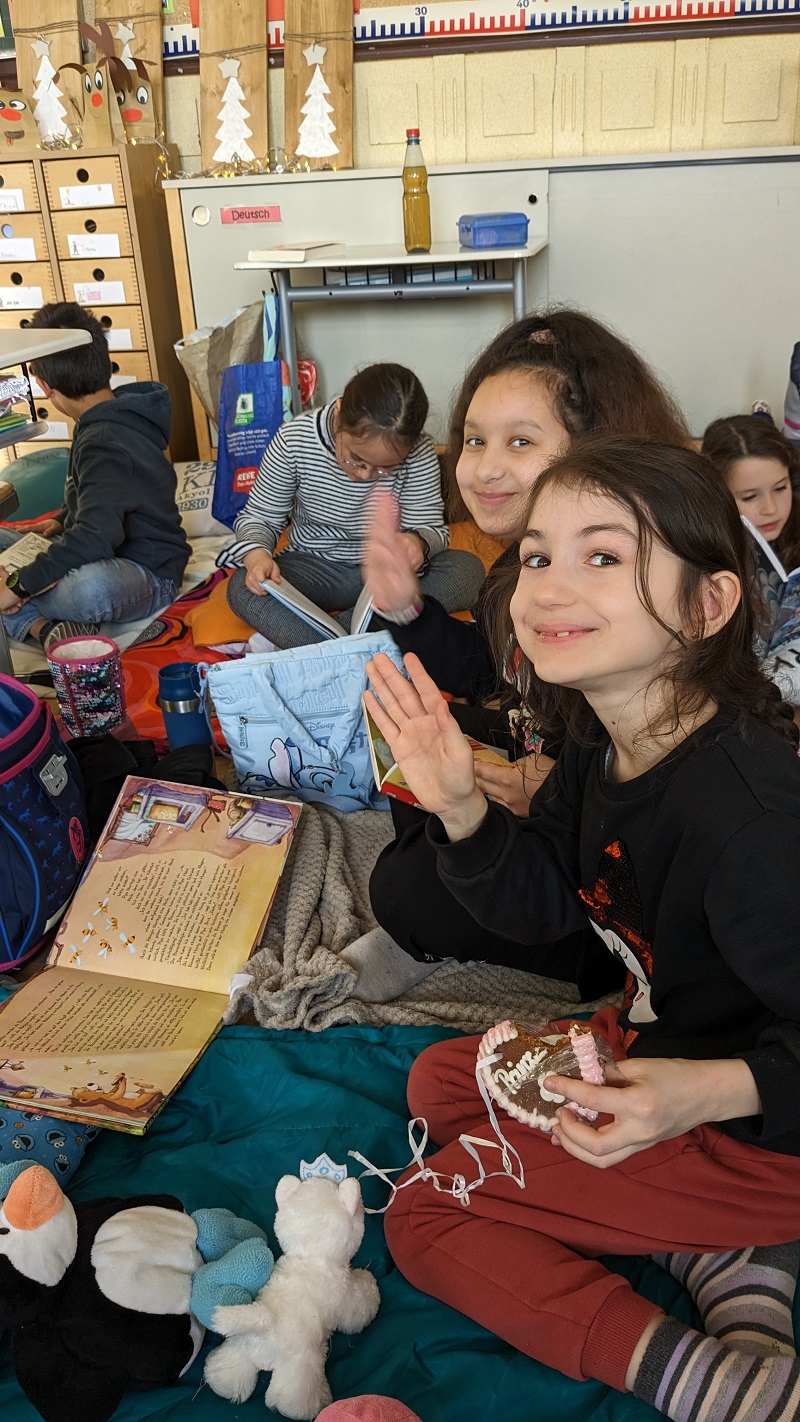 Mit Decken und Kiseen ausgestattet, erschien die Klasse 3a in der Adventszeit zu einer besonderen Unterrichtsstunde: die Kinder schmökerten und durchforsteten in aller Ruhe interessante und spannende Bücher.