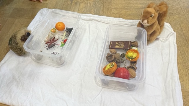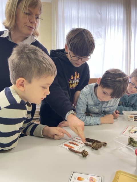 Danach waren wir drinnen und haben Tierspuren entdeckt. Dazu haben wir Tierfiguren sortiert und zum richtigen Pfotenabdruck gelegt. Auch mit den Überwinterungsstrategien einzelner Tiere machten wir uns vertraut. Wir haben außerdem neu gelernt, dass Eulen nicht jeden Bestandteil der Maus verdauen können - im Gegensatz zum Mäusebussard. Ebenso haben wir gelernt, dass der Borkenkäfer Tunnel unter den Bäumen graben kann. Darüber hinaus haben wir erfahren, dass Mäuse Tannenzapfen gründlich auffressen - im Gegensatz zu Eulen.