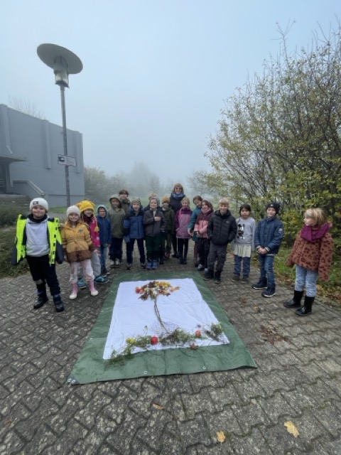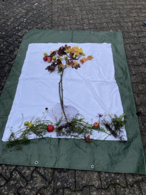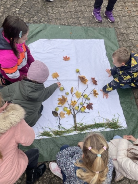 Verschiedene Aufgaben galt es zu bearbeiten: wie breit und lang ist die Fläche, wie viele Bäume wachsen darauf, welche Früchte sind zu erkennen oder auch das Beschreiben der Begrenzungen. Darüber hinaus gestalteten die Kinder in Land-Art einen Baum aus gefundenen Materialien und ergänzten diesen mit den Lebewesen, welche eine Streuobstwiese bevölkern.