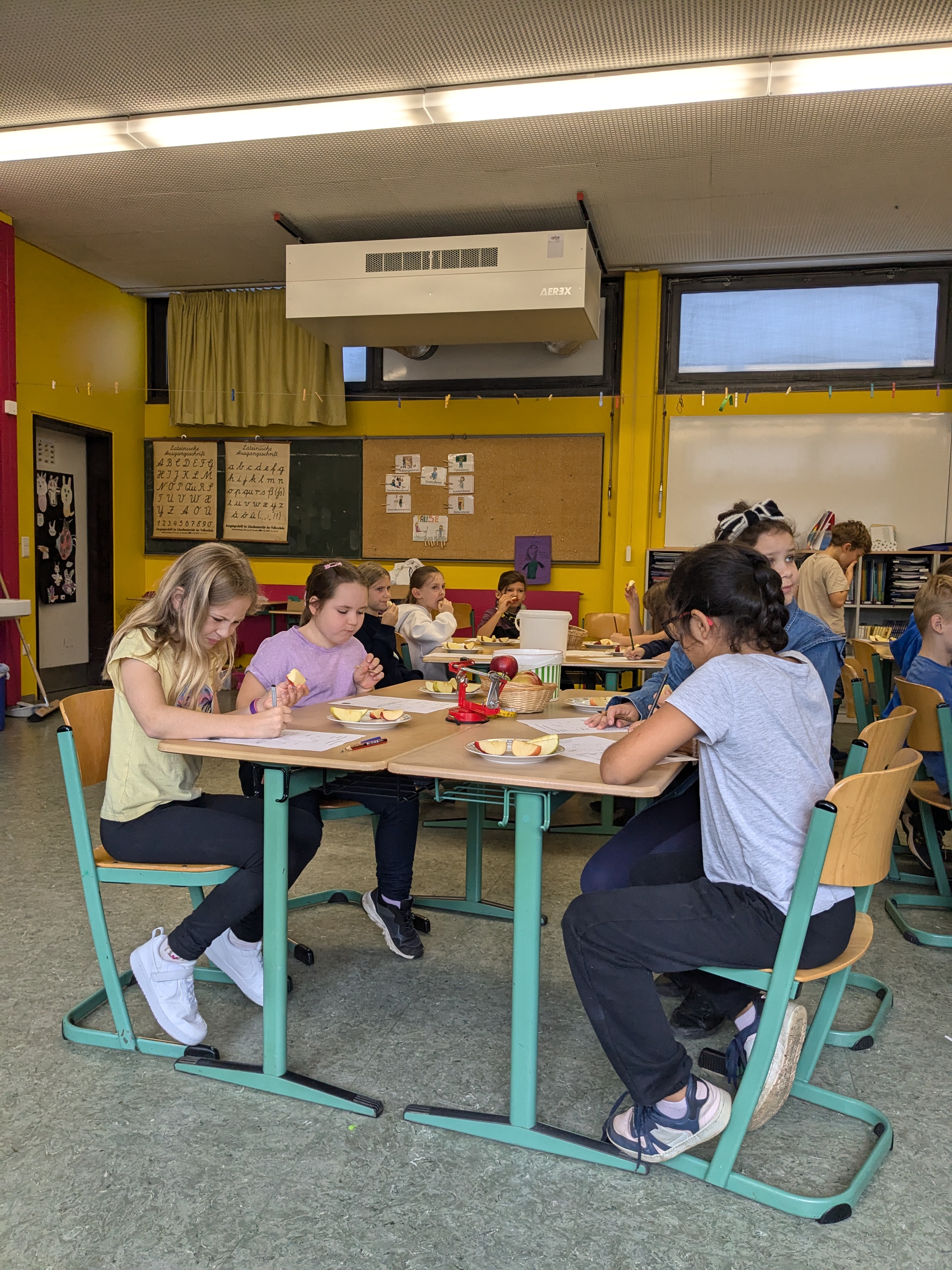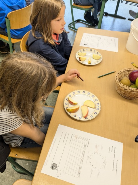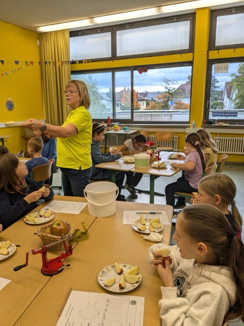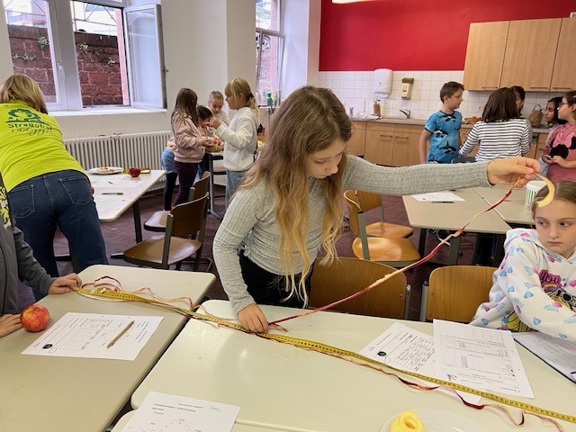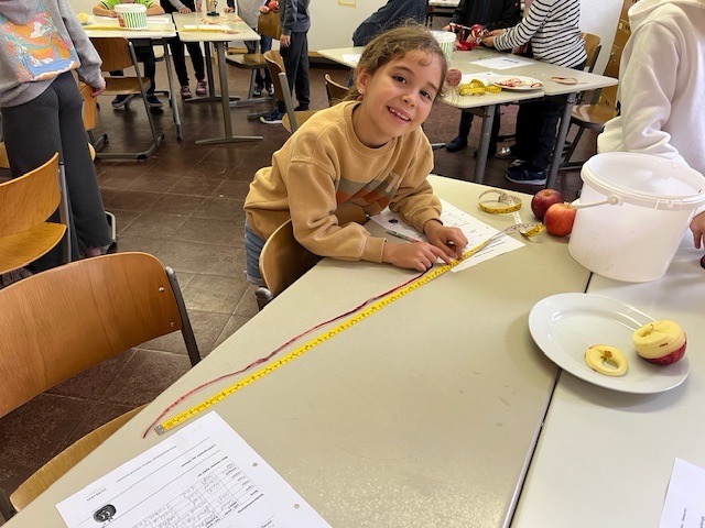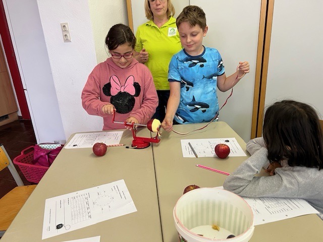 In der vergangenen Woche beschäftigten sich die Drittklässler im Rahmen des Streuobstwiesenprojekts mit unterschiedlichen Obstarten und Obstsorten. Dieses Mal führte uns der Weg allerdings nicht auf die Streuobstwiese. Stattdessen war Frau Schmidt-Schüssler zu Besuch an der Schule und hatte verschiedene Lernangebote vorbereitet. Zunächst präsentierte sie den Kindern mitgebrachte Äpfel, Birnen, Zwetschgen und Quitten und verdeutlichte im Unterrichtsgespräch, dass sich Obst in unterschiedliche Obstarten wie zum Beispiel Kernobst oder Steinobst unterteilen lässt. Im Anschluss ging es darum, die Vielfalt der Apfelsorten mit allen Sinnen zu erarbeiten und erfahrbar zu machen. Verschiedene Sorten wurden nicht nur durch Riechen und Fühlen beschrieben und unterschieden. Auch das Schmecken kam durch eine Verkostung der Sorten Topaz, Elstar, Freya, Wellant, Jonagold und Pinova zur Freude der Kinder nicht zu kurz. Die Tatsache, dass dabei auch die Lieblingssorte der Klasse ermittelt und in einer Urkunde dokumentiert wurde, motivierte die Kinder sehr. Die „Apfelschalenchallenge“, die am Ende durchgeführt wurde, stieß bei den Kindern auf besonders große Begeisterung. Mit Hilfe einer Apfelschälmaschine und einem Maßband wurde in Teamarbeit ermittelt, wem es gelang, beim Schälen die längste Apfelschale zu erzeugen. Zur allgemeinen Verwunderung wurden hierbei erstaunliche Längen erreicht.