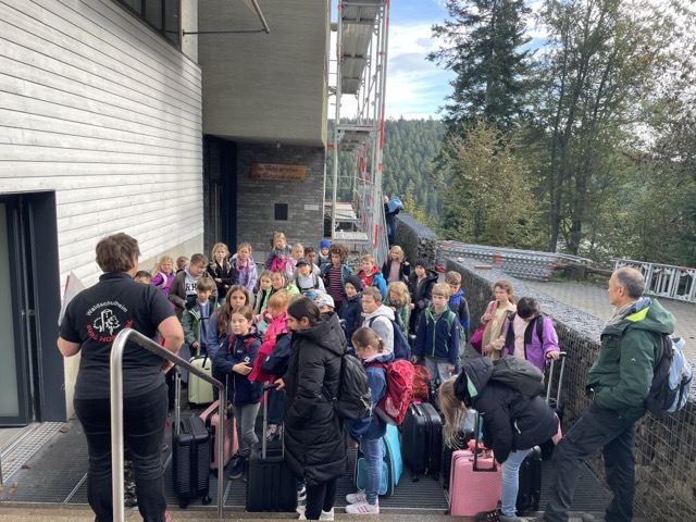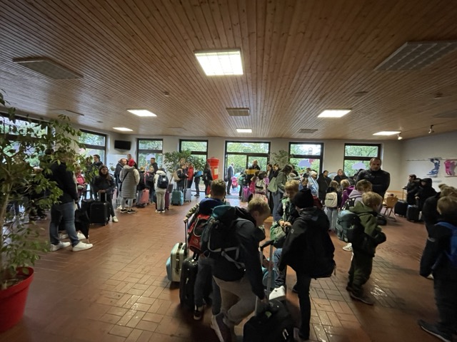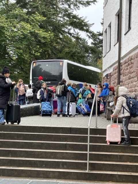 Die Kinder beider Klassen trafen sich in der Aula der Pestalozzi-Grundschule mit ihrem Gepäck. Gegen 9:00 Uhr verabschiedeten sie sich von ihren Eltern und bestiegen den Bus.