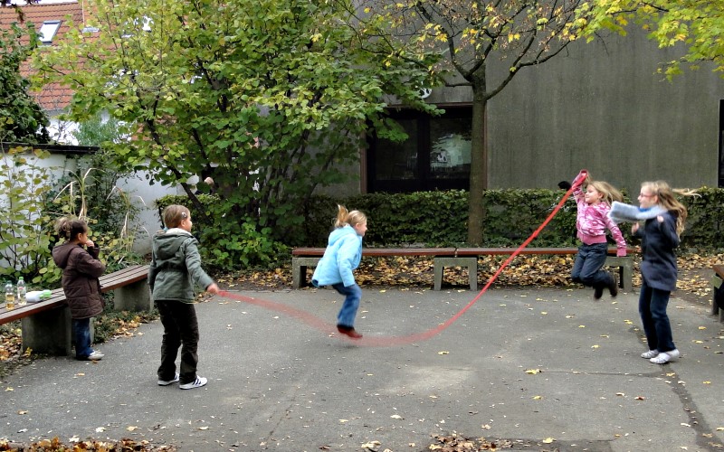 Große Spiel- bzw. Frühstückspausen gibt es von 9.25 Uhr bis 9.50 Uhr und von 11.25 Uhr bis 11.40 Uhr. Zwischen den anderen Stunden liegen jeweils 5-Minuten-Pausen zum Wechseln des Raumes. Während der Spielpausen können die Kinder mit verschiedenen Spielgeräten wie z.B. mit Bällen, Stelzen und Seilen spielen, die u.a. vom Förderverein finanziert wurden. Für die Ausleihe erhält jedes Kind einen Ausweis, ohne welchen ein Ausleihen nicht möglich ist.
